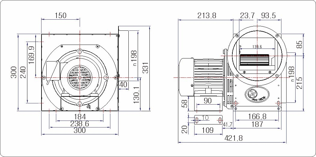 • 중간 차단팬 부착 고온용 시로코-팬(흡입온도 150℃ 까지 사용가능).
