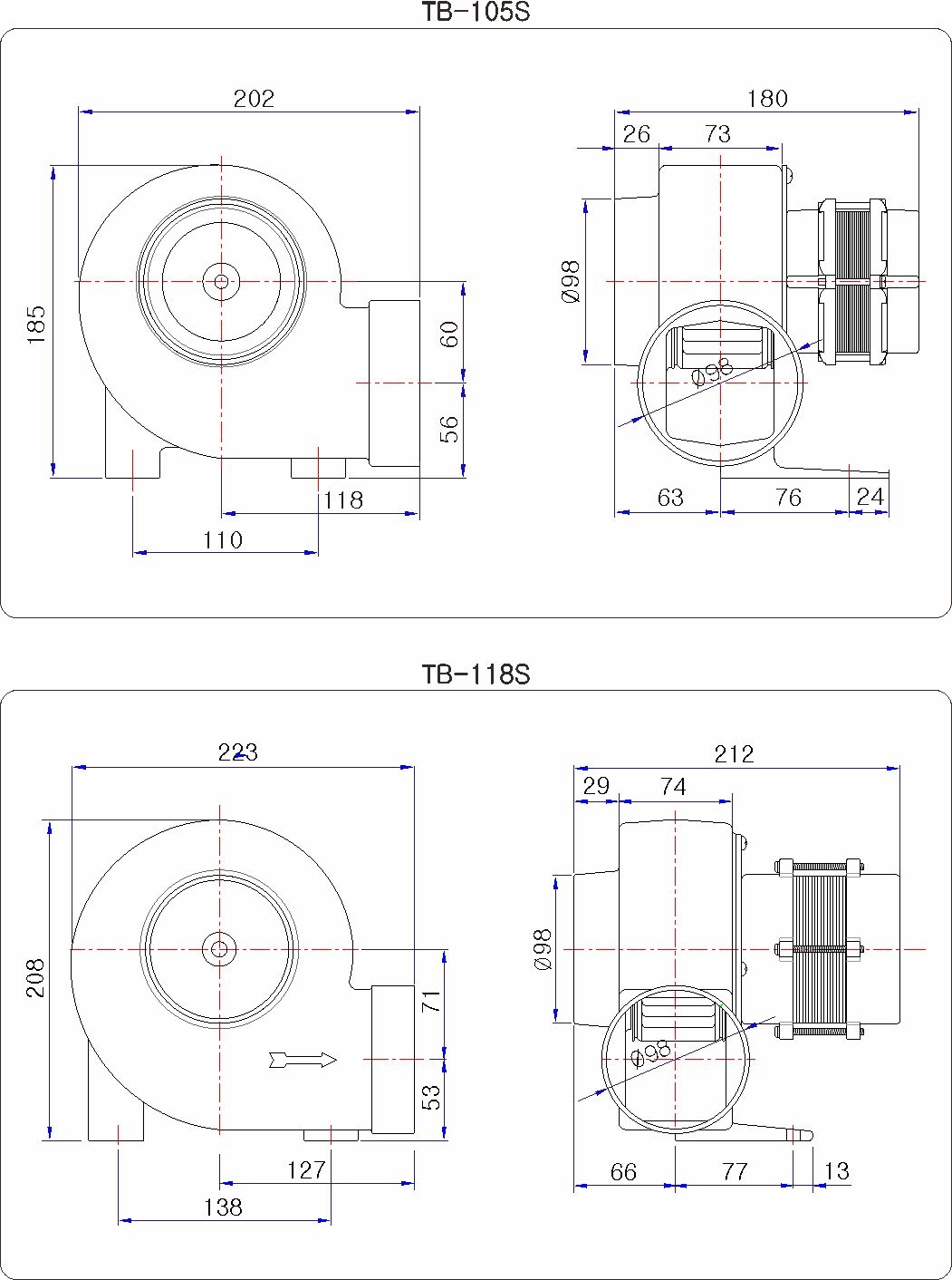 | TB-118S | 220V ~, 60 | Ø118×60T | 0.75 | 2 | 161 | 540 | 46 | 451 | 3,150 | 4.1 |