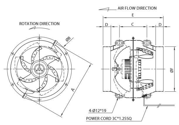- 유체역학에 기초한 톱형 사류 날개와 후면의 조정 날개 채택으로 저소음 설계