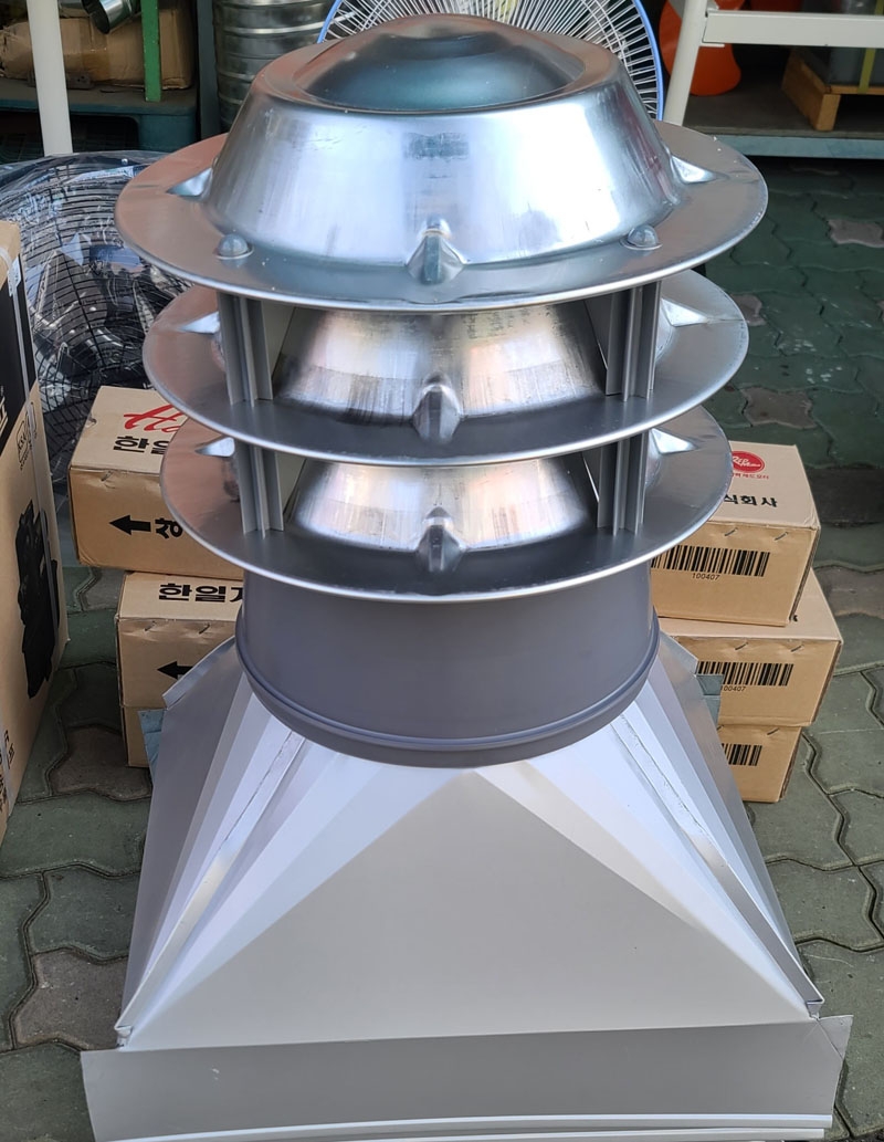 -과학적인 환기원리의 적용 원뿔모양 유도판 -외부의 바람이 적층된 원뿔 모양 △(125도)의 물체에 부딪혔을 때 공기의 흐름이 빨라져 발생되는 압력차로 흡출을 하는 방식 -환기의 마찰저항 최소화 -상하 바람 유도판과의 접촉면적이 넓고 견고하게 고정하여 몸체의 안정성을 강화 하였습니다